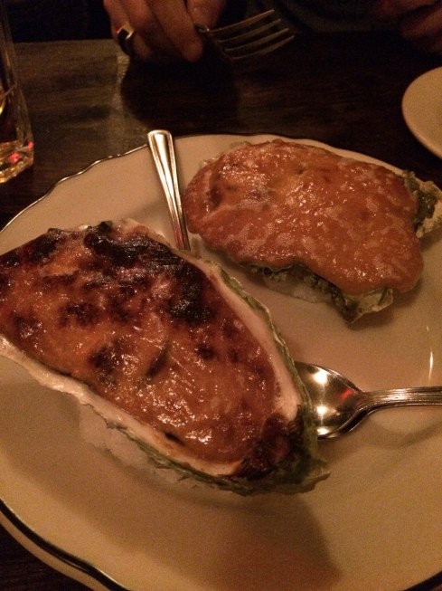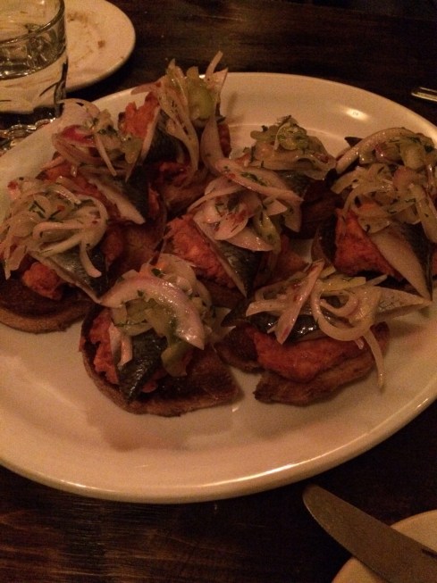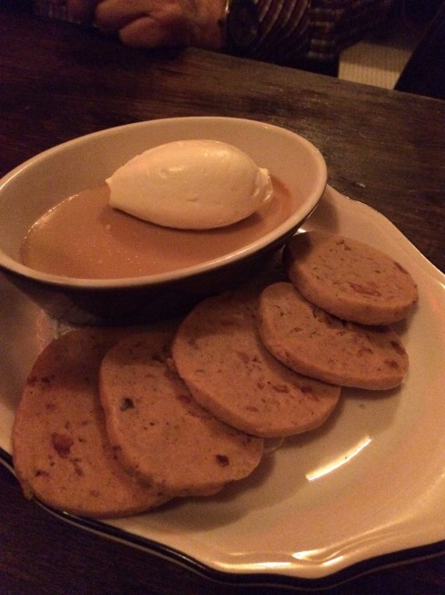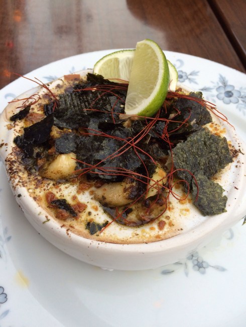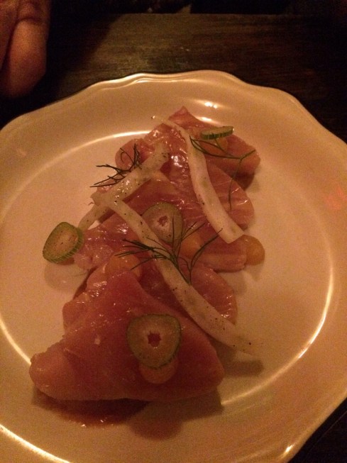 Next, Annie and I each had an partially cooked oyster with scotch butter served over top. I’m still trying to get my girlfriend into oysters…. it’s a slowly acquired taste apparently. The partial cooking of the oyster changed the texture somewhat but it was still enjoyable. The unique element here was the scotch butter. You could really pick up the inherent smokiness of the scotch with the richness of the butter. A cool little amuse-bouche.