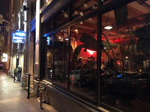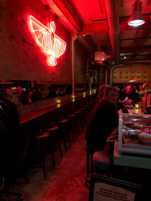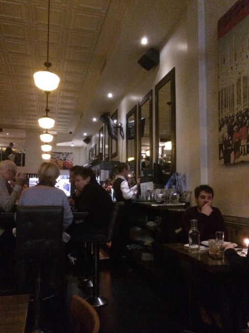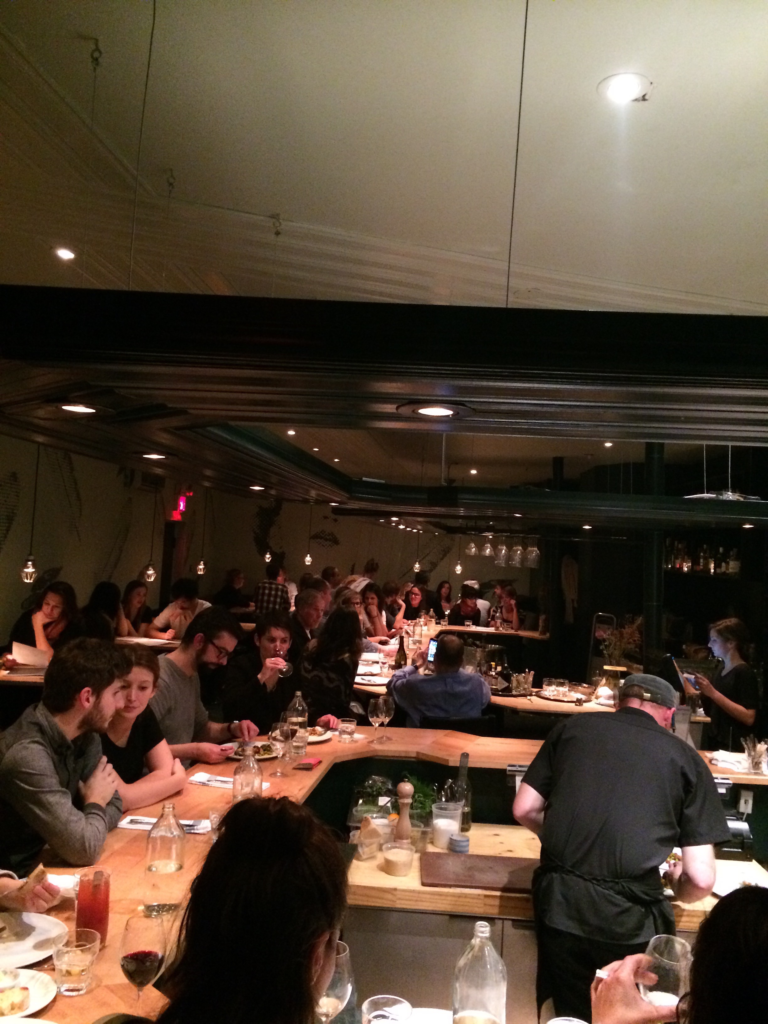 Le Petit Mousso is located in the Village, corner Ontario and Atateken. The two restaurants share the same entrance – such that I wasn’t sure which half was the Petit Mousso and which was Le Mousso when we walked in. The space is very clean and simple. The old white brick walls are accented with a bit of art work. The dining room is a two level space with a mix of tables and bar-style seating. There are industrial and modern touches with the central staircase that leads to the open kitchen in the basement which is probably the coolest element in the design of the space.