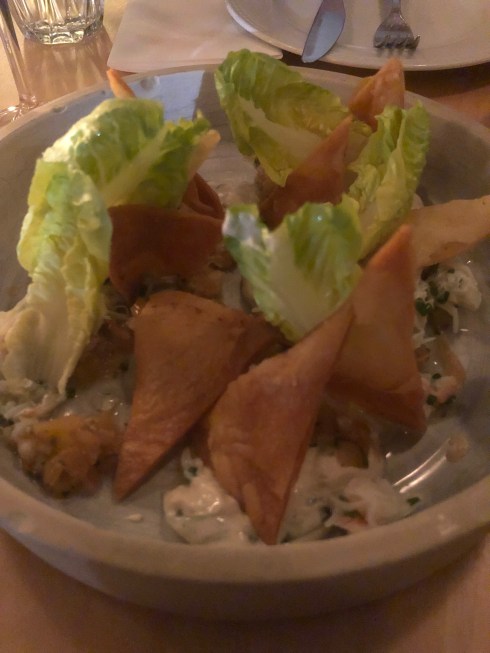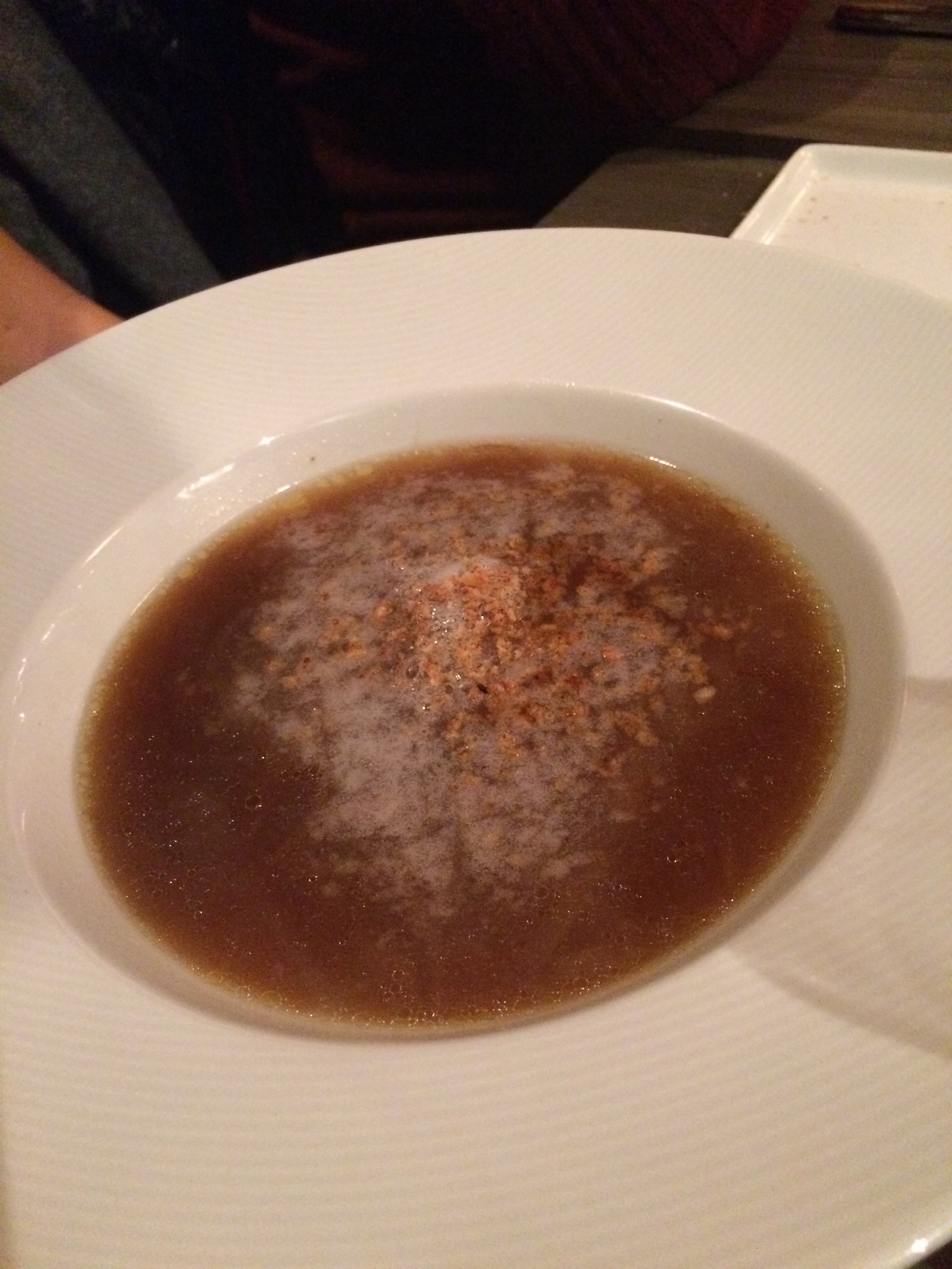 Our other appetizer was a plate of shrimp served in Kohlrabi ‘wrappers’ in a lightly flavoured tomato broth. Beautiful presentation on the table. A very subtle dish all-around. The shrimp were delicious and quite flavourful. I like the interesting use of the kohlrabi as a wrapper. Flavourwise, it didn’t really add much. A well executed and presented dish.