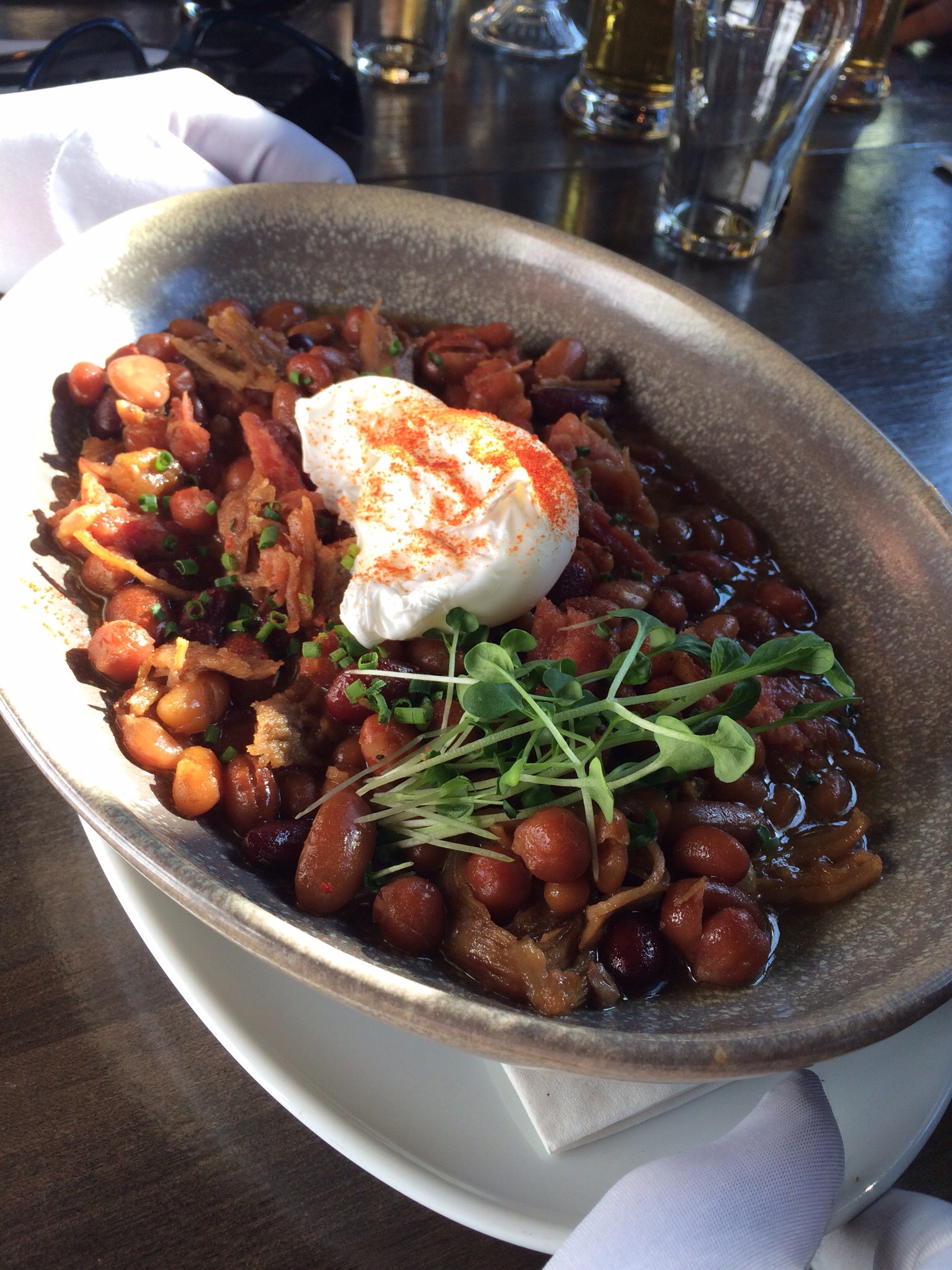 Foodwise, Le Trèfle’s Brunch menu is a interesting combination of standard breakfast/brunch fair with a Irish Pub twist. I got to try three different dishes amongst the dozen or so options. First up was their morning Irish stew which as my Irish friend said at the time wasn’t really a Irish stew but it didn’t matter because it was quite good. A mixture of mostly beans with ham, bacon, maple syrup and a poached egg, the stew was a filling meal. The maple syrup came though a lot which gave it more sweetness than you would expect in the stew but it was a hit at the table.