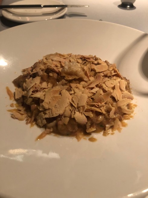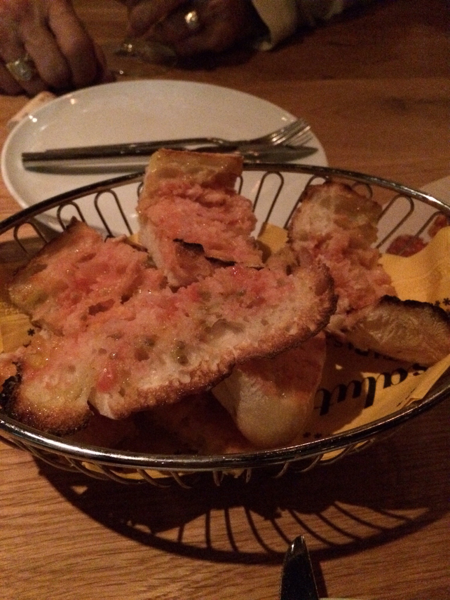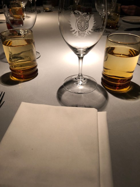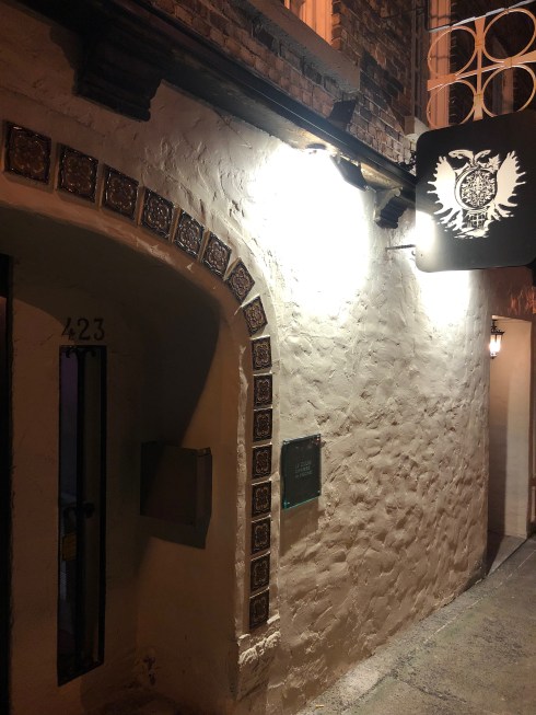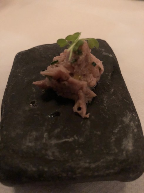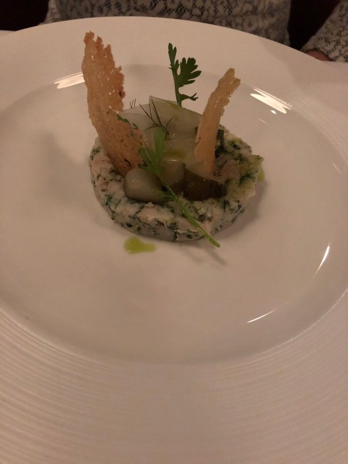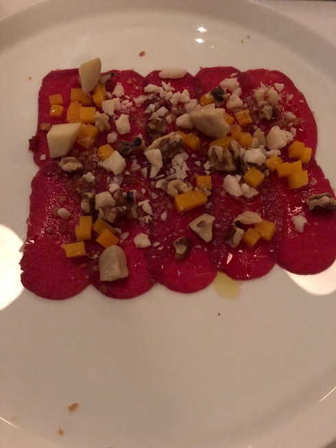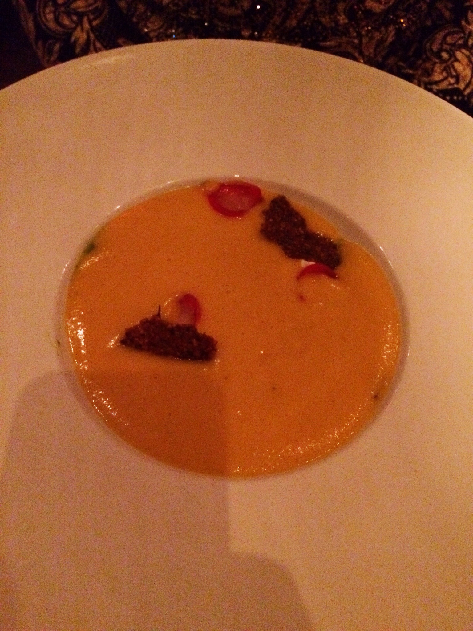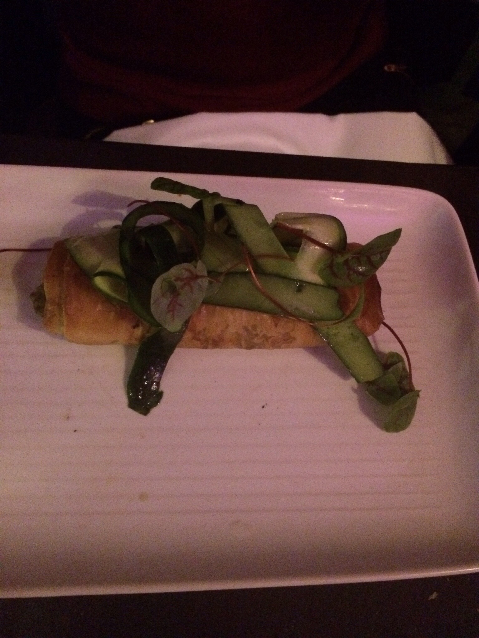 Located very unassumingly on a side street in the Old Montreal, Le Club Chasse et Pêche has a somewhat weird visual motif to me. Given the age of the building, they highlight some of its classic features – beautiful old stone walls and archways – in the periphery but the rest of the space is a mix of more modern touches – dark printed pattern wallpaper on the ceiling, black accent walls with a flat concrete-like finish, modernistic artwork, curved plastered walls which orient and separate the room in ways to make things feel more intimate but also weirdly disorienting. It works with the low lighting to create a very intimate ambience perfect for the type of special occasions that bring you to a place like this but personally not the type of style I enjoy.