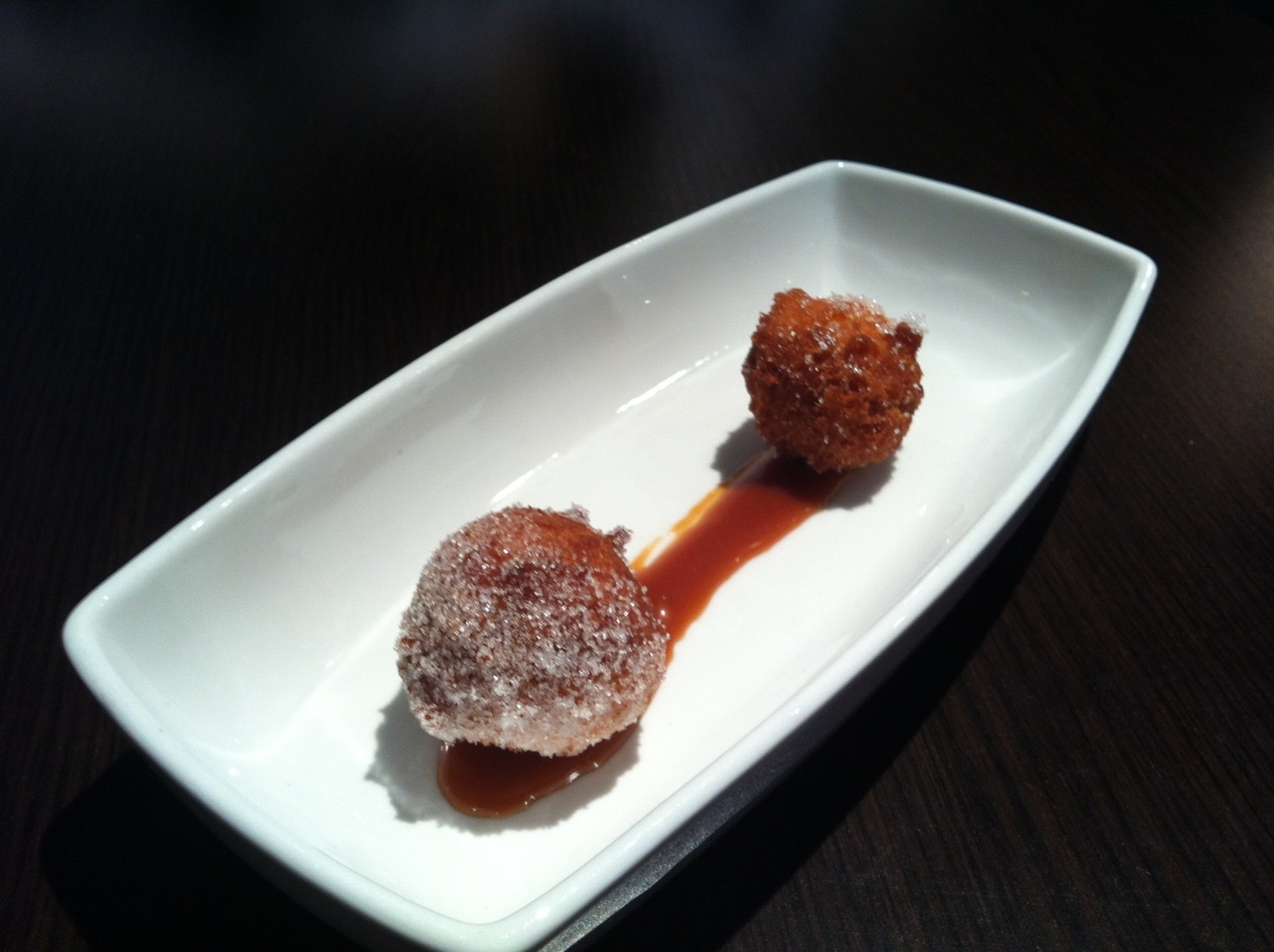 Next, Annie and I each had an partially cooked oyster with scotch butter served over top. I’m still trying to get my girlfriend into oysters…. it’s a slowly acquired taste apparently. The partial cooking of the oyster changed the texture somewhat but it was still enjoyable. The unique element here was the scotch butter. You could really pick up the inherent smokiness of the scotch with the richness of the butter. A cool little amuse-bouche.