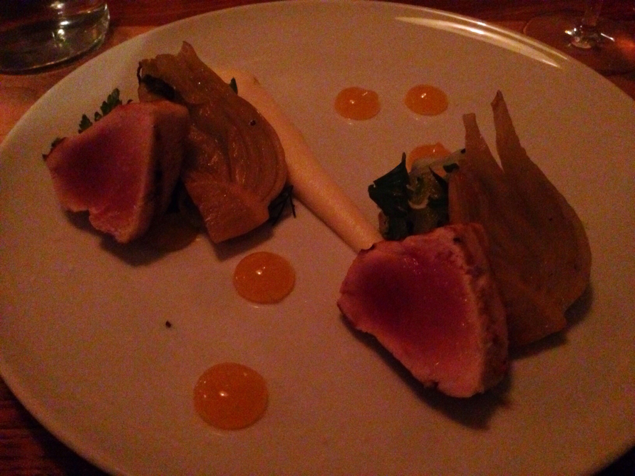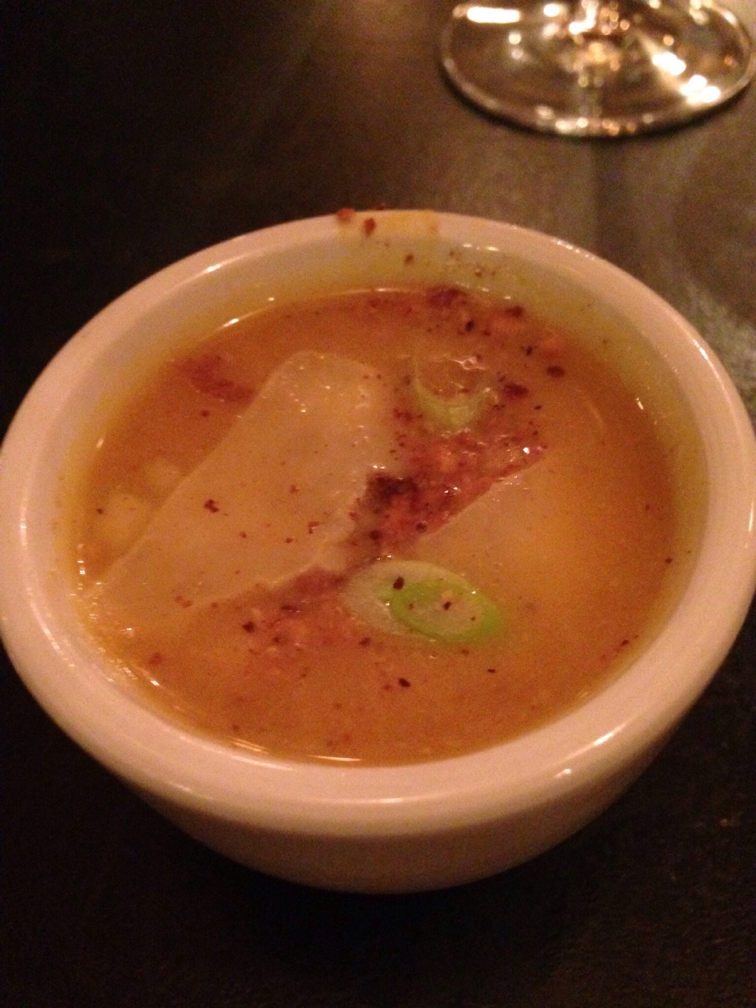 Prior to the actual menu, we received a small bowl of squash, corn and nut soup as an amuse-bouche. Nice and rich, we were pleasantly surprised by the addition of the corn and the nuts. The corn provided some sweetness and the nuts a little salt on top of the texture additions both provided. A nice starter to the meal.