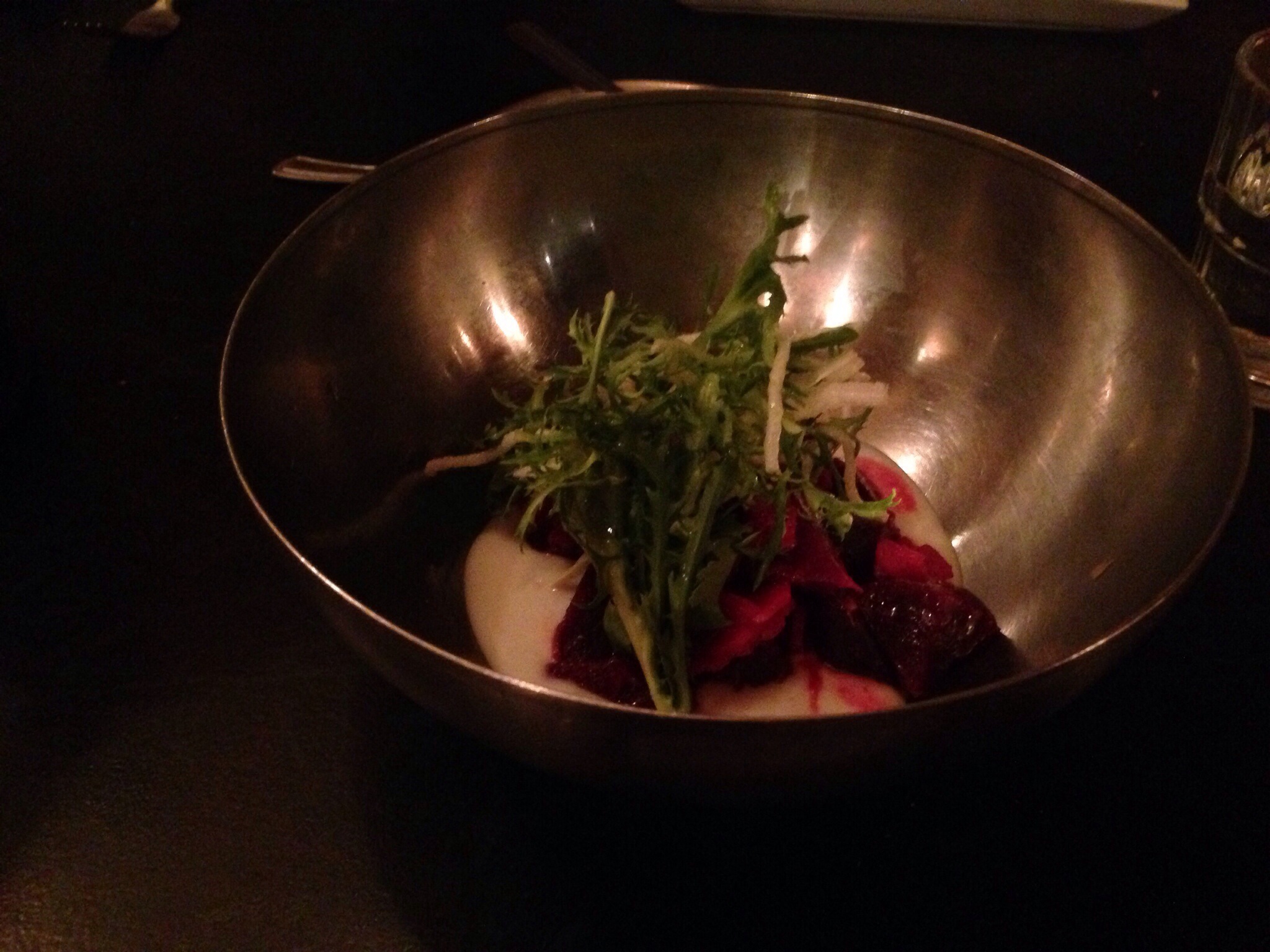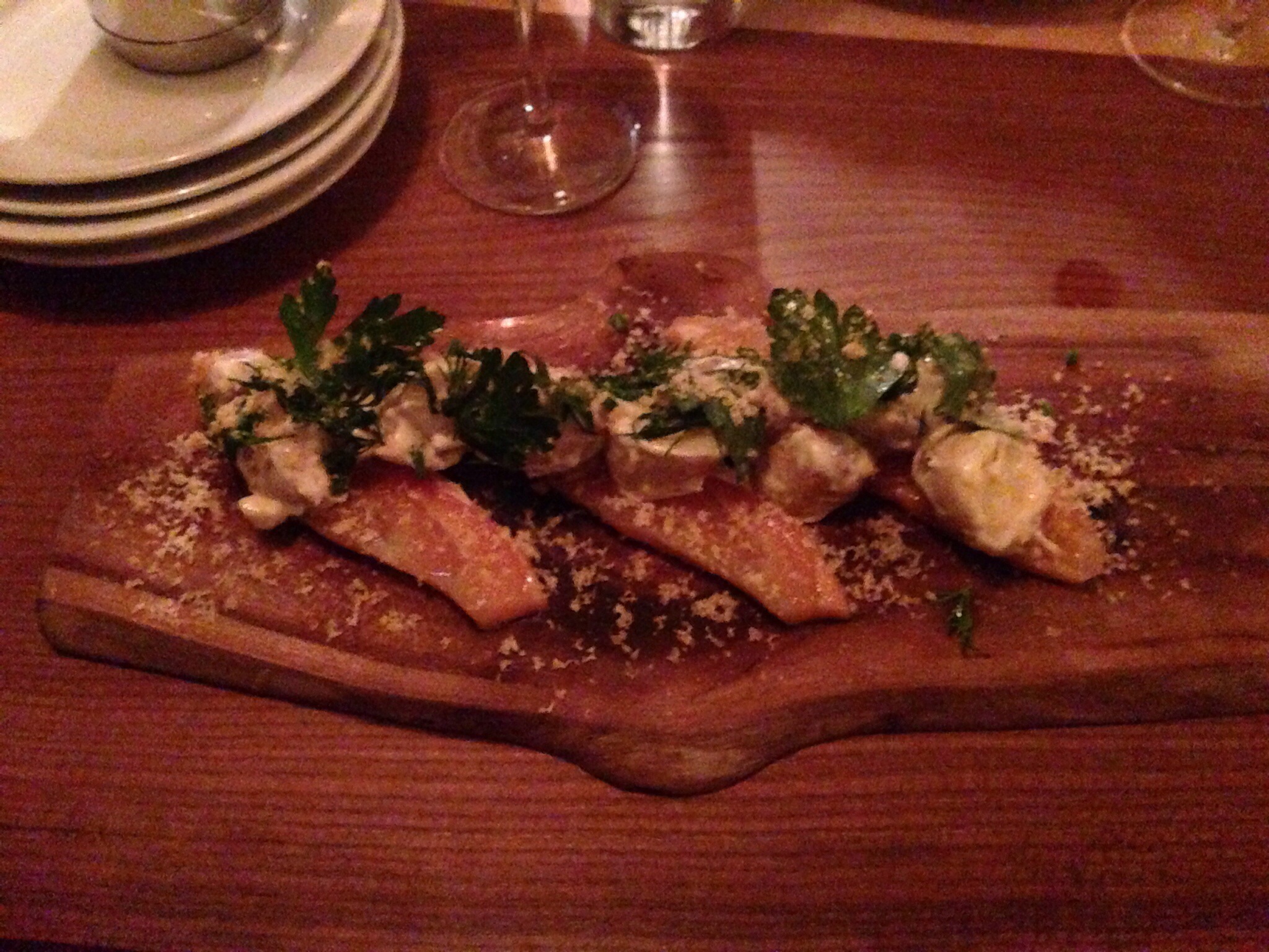 The third main was a play on Jewish chopped liver with bagel chips, capers and hard boiled eggs. Now, I have never been a big fan of chopped liver. Despite my enjoyment of foie gras, the texture of Jewish-style chopped liver always created a roadblock for me. I went in with some apprehension but came out loving it. The texture of the liver was not an issue and had that great fatty flavour. The pickled onions brought some sweetness to that dish. The hard boiled egg was perfect and the bagel chips added that little bit of crunch and saltiness. A very well executed dish.