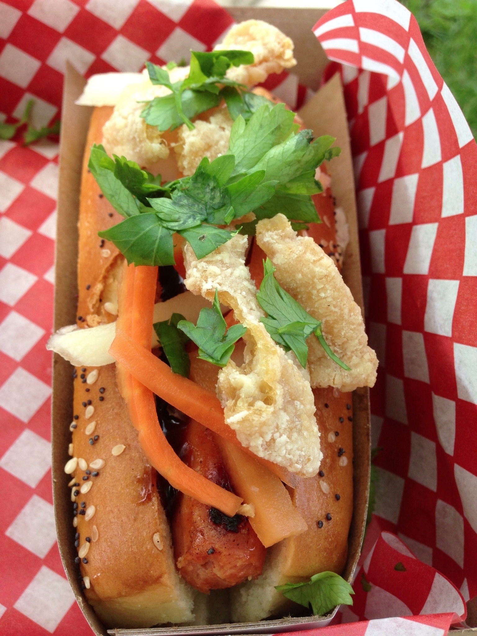 Secondly, the “Wu Dog”. A very unique Asian-inspired play on the standard hot dog. Here you have a grilled sausage with a sesame/poppy seed bun, marinated carrots and Daikon radish,crispy chicken skin and hoisin sauce as a condiment. Big winner for me on this day. Each individual component was well done and created interesting contrasts in terms of both texture and flavours. In particular, the use of the marinated vegetables and hoisin sauce really added a lot for me. I loved the chicken skin but honestly their presence made it hard to actually bite into the hot dog as one would want to do. I ended up eating most of it separately and leaving myself smaller pieces to actually bit into on top of the hot dog. Regardless, a very creative option to be offering in this truck.