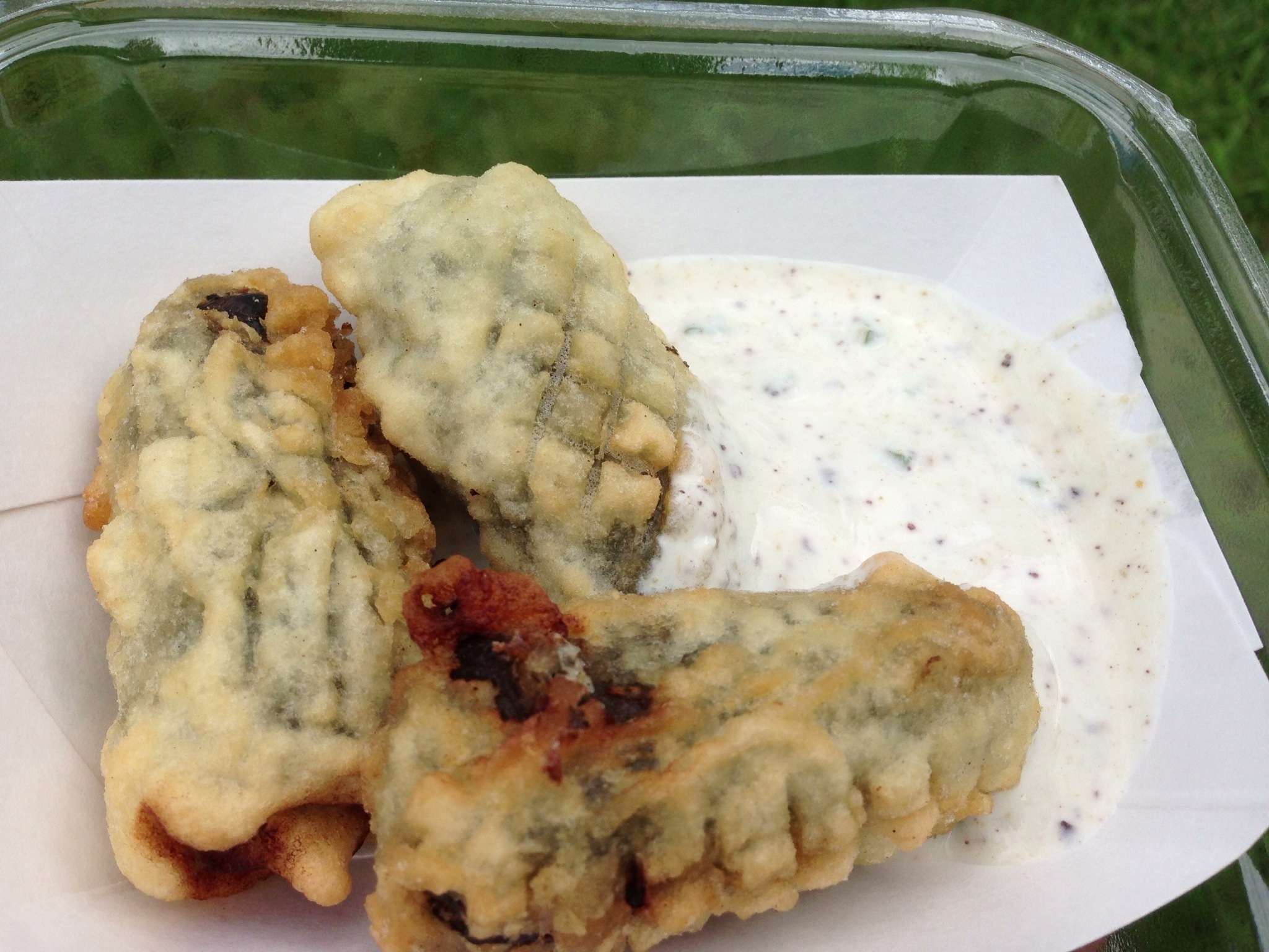 Up first, Le Cheese – a truck all about cheese and the different ways one can enjoy cheese. On my first visit, saddened by the Fried Cheesecake being sold out (more on that later…), I went for their special of the day – a fried onion, bacon and swiss grilled cheese. A nice size sandwich – the bread had a great grilled crisp exterior and the combo of onions and bacon gave a nice fatty sweetness to the sandwich. The swiss wasn’t completely melted to my liking but honestly a minor quibble. Still a great sandwich.