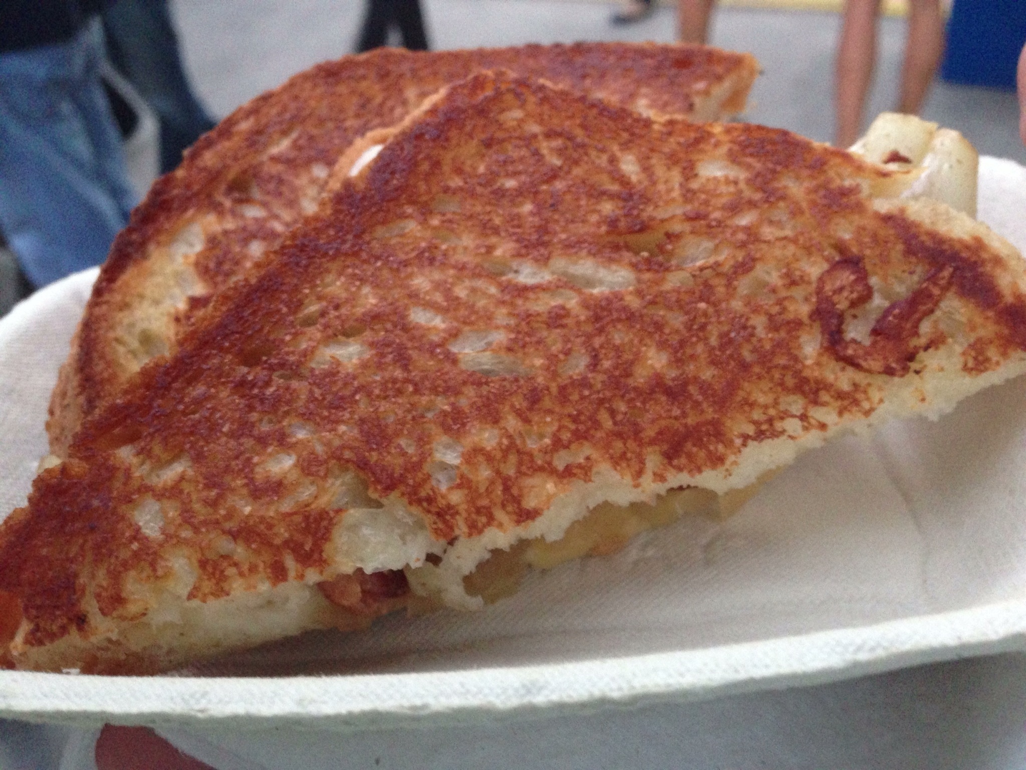 This past weekend, I was able to make his first visits to the area to continue my quest of trying all the trucks. First up, I hit up P.A. & Gargantua from some grill-cheese sandwiches. Gargantua is all about gourmet grill-cheese using local Quebec cheese, unique breads and adding some extra goodies to make an awesome sandwich. On this day, they were using cheddar from L’Ile-aux-Grues and a Mie au lait bread. I decided to try the bacon sandwich – which adds bacon, shallot confit and smoked butter.