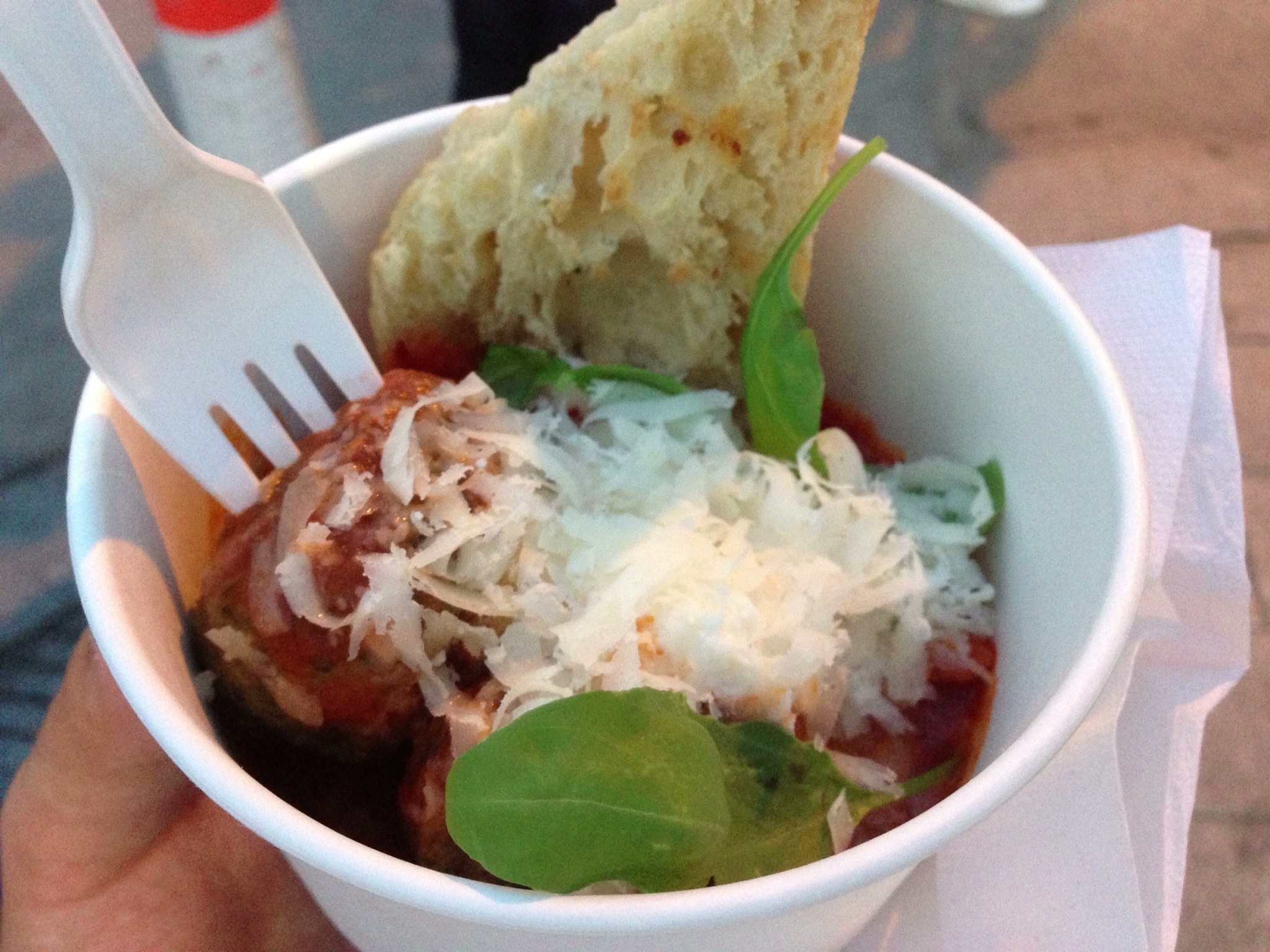 In one order, you get 2 meatballs with two pieces of bread, some tomato sauce, fresh basil and freshly grated Reggiano cheese. The bread was nice and crispy, the tomato sauce provided a nice tangy flavour and the fresh basil and Reggiano provided some bite but let’s be honest… none of this matters if the meatballs aren’t up to snuff. Thankfully, these meatballs are quite good. I think the key thing with meatballs is texture. Firm enough to hold together but still tender enough to really let the flavours of the meat and binders to come through. Perfect in this case. The meatballs could be cut quite easily just using a fork but they didn’t fall apart afterwards. A great and unique truck concept that truly stands out from the crowd.