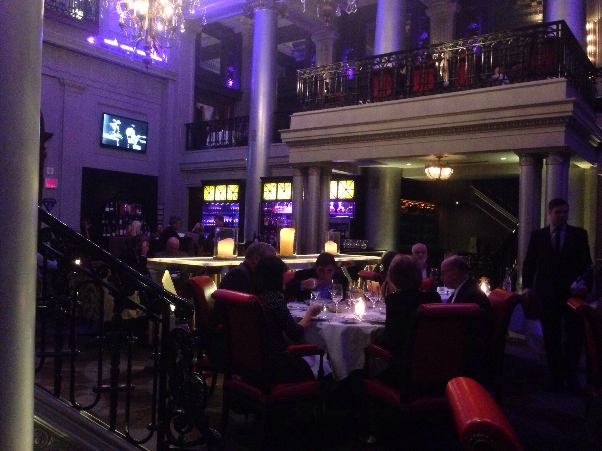 Visually, Taverne Gaspar attempts to blend the pub or tavern look with elements of the old Montreal building it is located in – a nice long wooden bar with wooden seats, leather banquettes and chairs, tile flooring and roofing, low lighting with the exception of the christmas lights set up along the center of the room. That choice along with the use of dark tones elsewhere to put emphasis on the old stone walls creates a very relaxed old world kind of feel. The night we were there the entire street actually lost power so at one point for a bit, the lighting was almost completely candlelight so that intimate feel was cranked up further! Thankfully the lost power didn’t affect our meal…