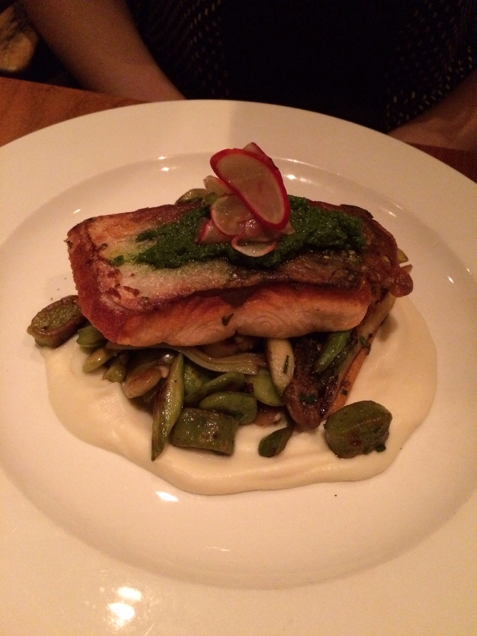 The first of our mains was the fish of the day – in this case, salmon – with herbed ricotta gnocchi, morels, fiddleheads, fava beans, carrots, Tokyo turnips, sorrel, daylillies, salsa verde and root vegetable puree. The fish was beautiful but the star here was the herbed ricotta gnocchi – rich and fluffy delights. The inherent earthiness of the fiddleheads, morels and fav bears were an interesting pairing with the creaminess of the puree and the fresh kick from the salsa verde. Enjoyable all around.