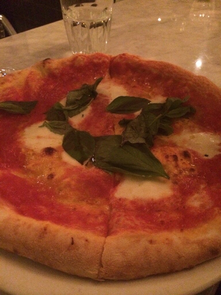 Gema itself is a relatively small restaurant – all of about 40 seats probably and they don’t take reservations, so you may have to wait to get in. In our case, we waited about 30 minutes. The nice part is that they will take your phone number down and call you so you can go from a walk or grab a drink elsewhere in the meantime. If you prefer, there is a takeout window on the side where you order a pizza to-go or some frozen custard. The interior is sparse but clean – old wood panels on the wall, aged hardwood on the floors with a weird light “tree” in the middle of the room adding some color to the space. The other focus point is the bar with its marble countertop although I got a good laugh that the bar chairs are the same Ikea ones I have in my apartment. The space isn’t a looker like its neighbour Impasto but that’s not an issue for me.