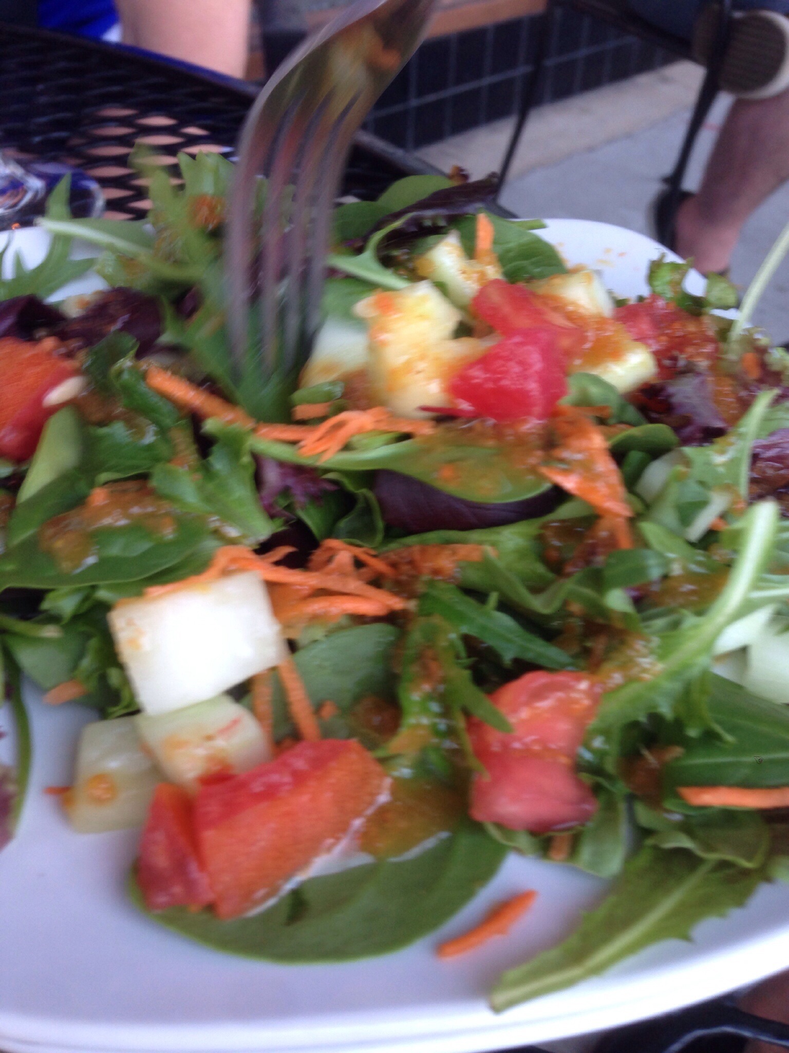 Food-wise, The Bee’s Knees goes for a global cuisine approach to tapas. For starters, we went for tequila-lime guacamole with fresh-fried tortilla chips, the house salad and the hand cut red potato fries with 2 of their sauces (dill feta and spicy aioli). The guacamole was of the thicker persuasion – the avocado not being pureed completely. The tortilla chips thankfully were thick enough to not break when scooping up the dip and the tequila addition came through just enough to add some punch. The house salad was okay – a good combination of fresh vegetables and a little light dressing – like most house salads. The fries were delicious – thick cut as I like them but with a good crunch to them. The 2 sauces were a good contrast – the spicy aioli provided some kick (likely from siracha) and the dill feta dulled that down.